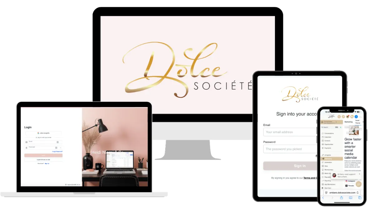 Full access to Dolce Société™ – your all-in-one platform for email, automation, courses, landing pages, and more